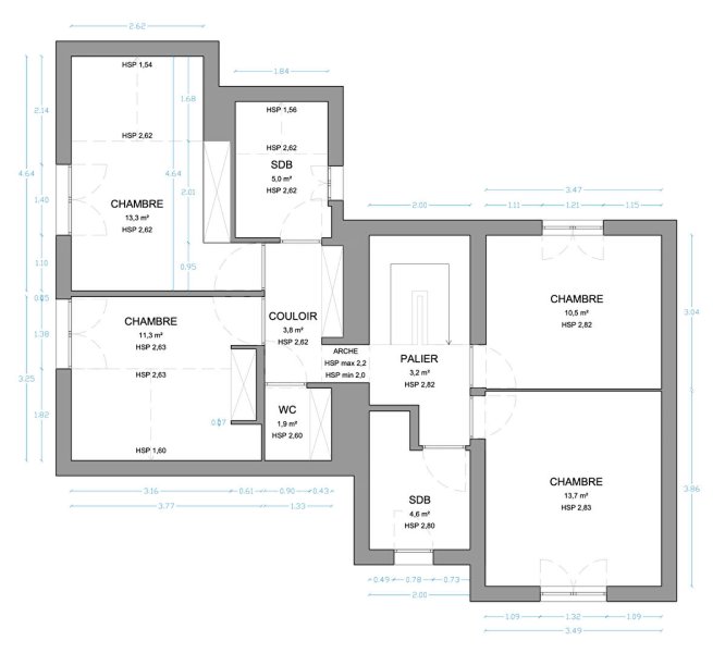 Le premier étage accueille quatre chambres aux beaux volumes, deux salles de bains et un WC indépendant.