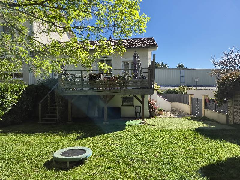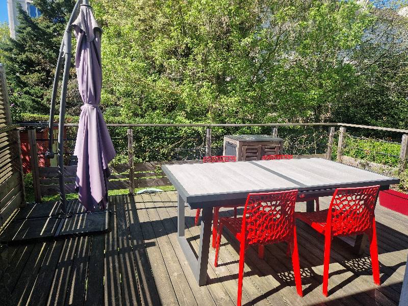Elle souvre sur un séjour lumineux donnant sur une vaste terrasse en bois de 18 m² et un jardin arboré sans vis-à-vis avec abri. Elle dispose au même niveau dune cuisine toute équipée, dune chambre, dune salle de bain, dun débarras et de wc.