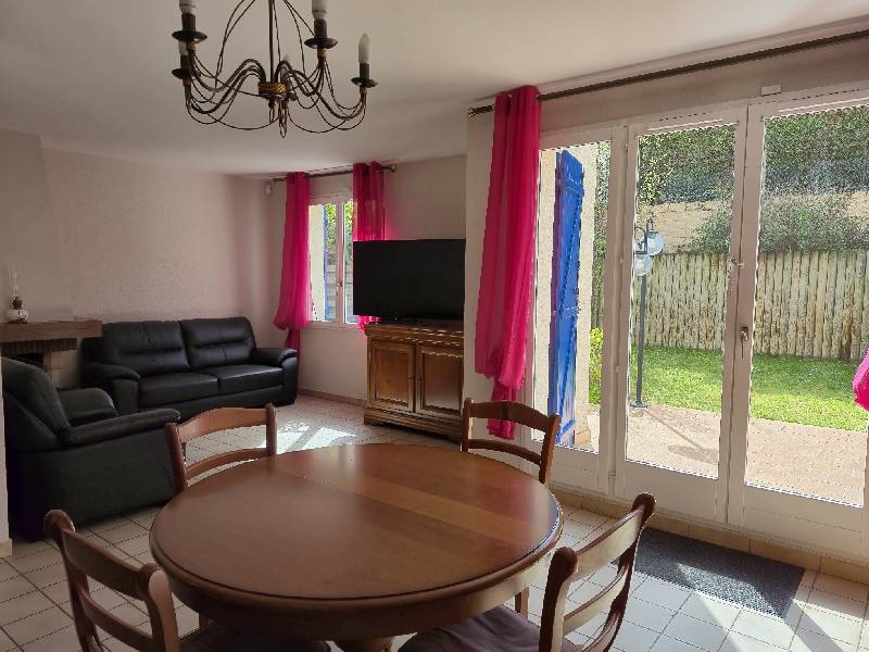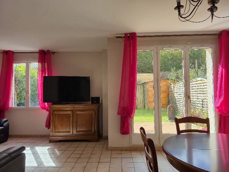 Elle offre un double séjour lumineux avec cheminée ouvert sur une terrasse et un jardin sans vis-à-vis avec abri.