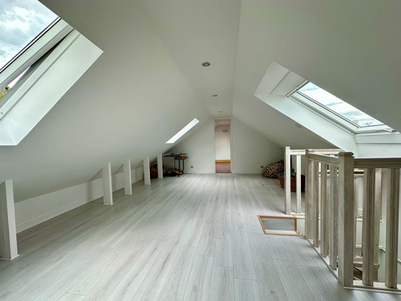 Combles aménagés : une vaste salle de jeux baignée de lumière ainsi qu'une pièce isolée parfaite pour un bureau ou un espace créatif