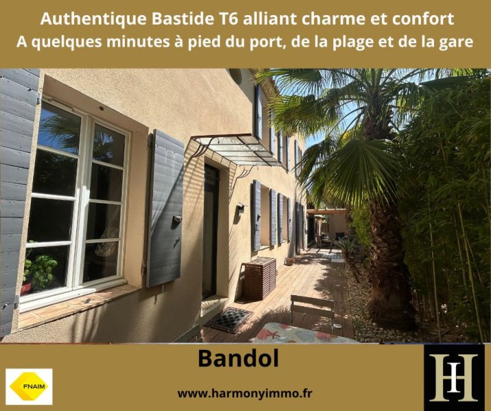 ? BANDOL À seulement quelques minutes à pied du port de Bandol, de la gare et de la plage, découvrez cette superbe bastide T6 de 1850 entièrement rénovée, d'une superficie habitable de 164m2, alliant charme provençal et confort contemporain.Dès l'entrée, la maison séduit par ses volumes généreux et sa luminosité.Le séjour habillé de plancher massif agrémenté d'une cheminée à insert offre un espace chaleureux et convivial, intégrant une cuisine semi-overte équipée à l'esprit familial pour un total de 55m2. Il se prolonge naturellement par une magnifique véranda de 20m2 à double vitrage accueillant de conviviales tablées estivales et hivernales chauffée par un poêle à .La maison propose une organisation idéale:1 Suite parentale avec salle d'eau en rez-de-jardin, toilettes, buanderie-4 chambres à l'étage-2 Salles d'eau. À l'extérieur, vous profiterez de 120 m2 de terrasses en bois exotique, véritables espaces de vie baignés de soleil, avec jacuzzi pour des moments intimistes de détente toute l'année sans entretien de jardin.Trois places de parking intérieures- Carport- Grand atelier pour stocker et bricoler- Abri à bois. Ambiance 'Authentique maison de famille' où il fait bon vivre toute l'année, recevoir pendant les périodes estivales.ainsi qu'un excellent rapport locatif saisonnier. DPE-C : CES-178 / GES:6-B. Estimation des coûts annuels d'énergie du logement entre 2230EUR et 3090EUR/an- Année de référence 2023. Les informations sur les risques auxquels ce bien est exposé, y compris l'obligation légale de débroussaillement,sont disponibles sur le site Géorisques https://www.georisques.gouv.fr Contact: Pascale TORT 06 60 07 95 01- pascale.tort@harmonyimmo.fr www.harmonyimmo.fr