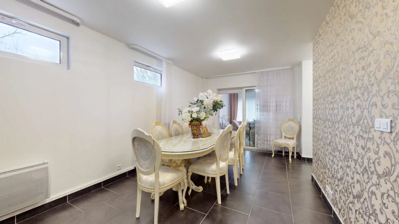 La maison est composée au rez-de-chaussée d'une vraie entrée avec un premier coin salon, une grande salle à manger pouvant accueillir tous vos convives et une cuisine indépendante moderne donnant sur une terrasse. Un wc complète le niveau.