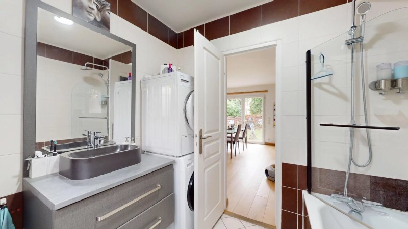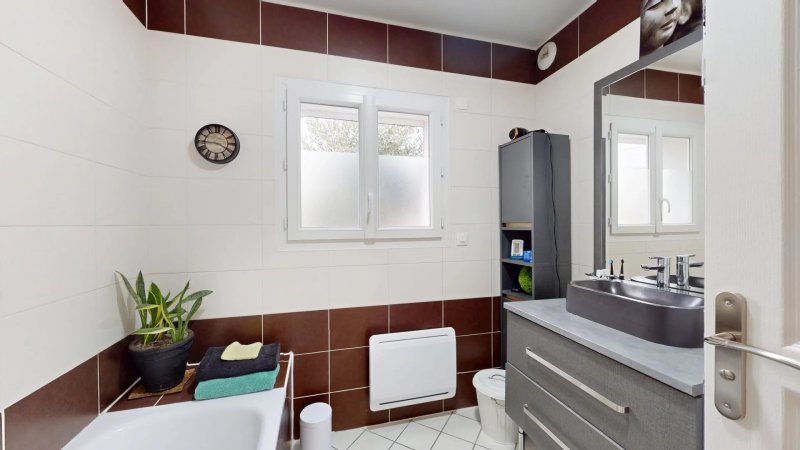 Au rez-de-chaussée : La maison dispose d’une entrée avec placard qui dessert un séjour très lumineux de 27m2 avec une cuisine ouverte, équipée et récente avec l’accès à la grande terrasse arrière et au jardin intimiste plein sud ! Le niveau est complété par une belle salle de bain, un WC indépendant avec fenêtre, et l'accès à une cave à vin en sous-sol.