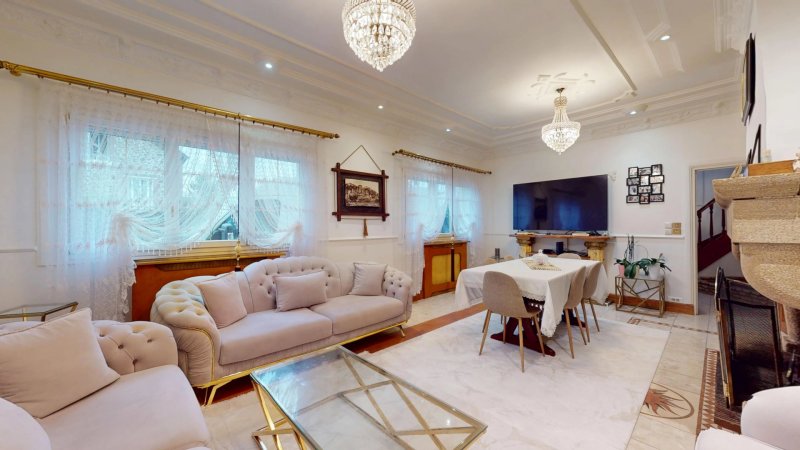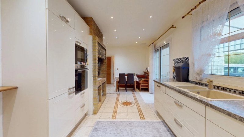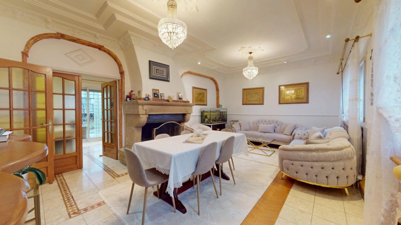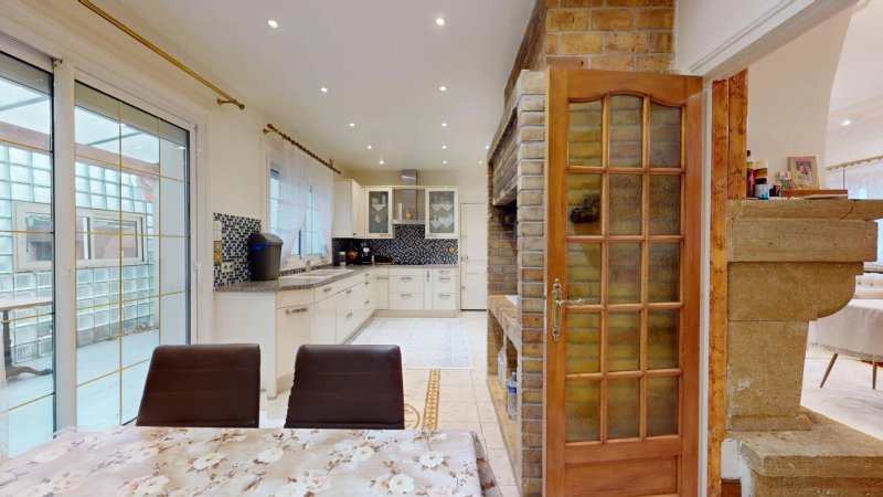 Édifiée sur un terrain d’environ 300 m², la maison séduit dès l’entrée par ses volumes remarquables et sa hauteur sous plafond de 3 mètres au rez-de-chaussée, offrant une vraie sensation d’espace et de luminosité. Ce niveau propose un salon de 30 m² avec cheminée, une vaste cuisine de 20 m² avec espace cheminée pour cuisiner, une première chambre, un WC indépendant ainsi qu’un garage attenant de 30 m².