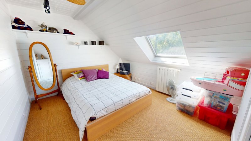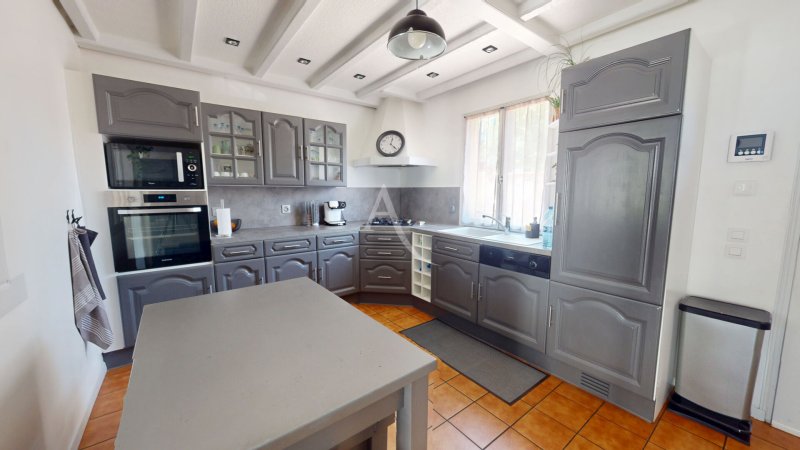 Édifiée sur une parcelle de 376 m², elle se compose au rez-de-chaussée d'une cuisine dinatoire conviviale, d'un séjour lumineux avec cheminée donnant directement accès à une agréable terrasse et à un jardin arboré, d'une salle d'eau avec double vasque et wc ainsi que d'un bureau avec rangements pouvant faire office d'une chambre.