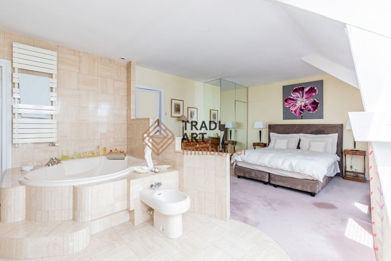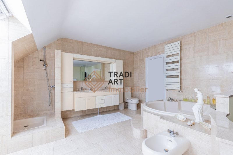 À l'étage, un palier desservant deux chambres de 12m², une suite parentale de 30m² avec douche, baignoire balnéo, wc et dressing, un espace bureau (possibilité d'une chambre supplémentaire), une salle de bains et wc indépendants.