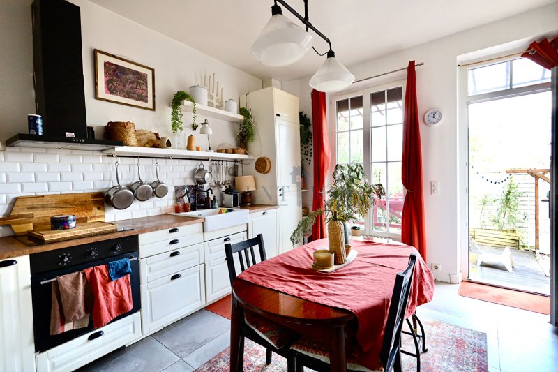 au RDC : belle Entrée avec mosaique d'époque, Séjour spacieux avec beau parquet en point de Hongrie et cheminée d'époque en marbre, grande Cuisine séparée dinatoire avec accès terrasse.
