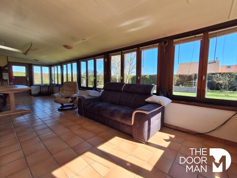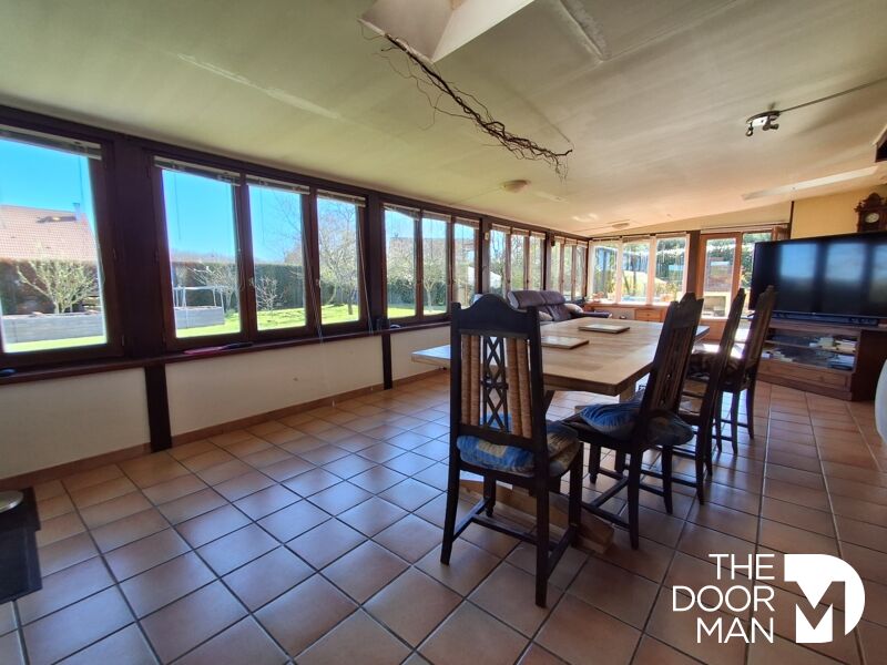 Une superbe véranda lumineuse donnant sur le jardin, équipée d'un poêle à granulés