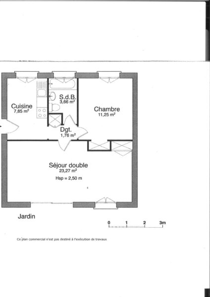Une maison phénix de 47 m² de 2 pièces comprenant une entrée sur cuisine, dégagement, salle de bains, chambre avec placard, séjour de 23 m².