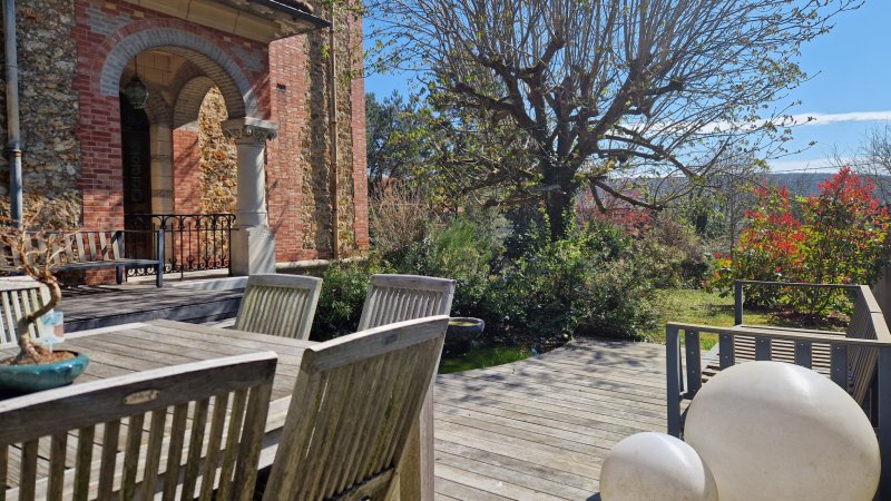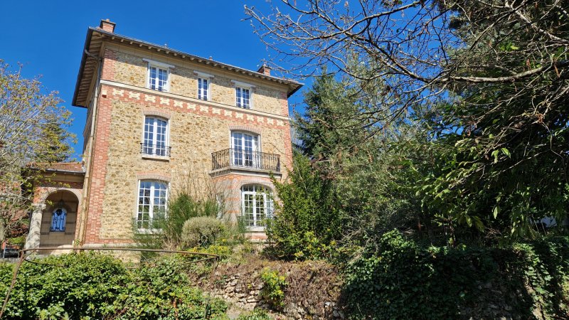 Proche RER. Plein sud. Demeure de charme de la fin du 19ème siècle de 230 m2 habitables édifiée sur cave et comprenant : Au rez-de-chaussée : entrée, cuisine équipée ouvrant sur terrasse, salle à manger, salon, salon tv et wc. Au premier niveau : deux chambres (16 et 21 m2) dont une avec sa salle d'eau privative, salle de bains et wc. Au deuxième niveau : trois chambres, deux salles d'eau, dressing et wc. Parquet. Cheminées. Maison annexe disposant de deux chambres, cuisine équipée, salle d'eau et wc. Un garage et un abri de jardin complètent l'ensemble. Le tout sur 1277 m2 de terrain.