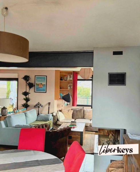 La pièce de vie, véritable coeur de la maison, développe près de 55 m² baignés de lumière. Ouverte sur la terrasse et le jardin, elle accueille un élégant double séjour réchauffé par une cheminée, ainsi qu'une cuisine ouverte, entièrement aménagée et équipée, pensée pour les moments de convivialité.