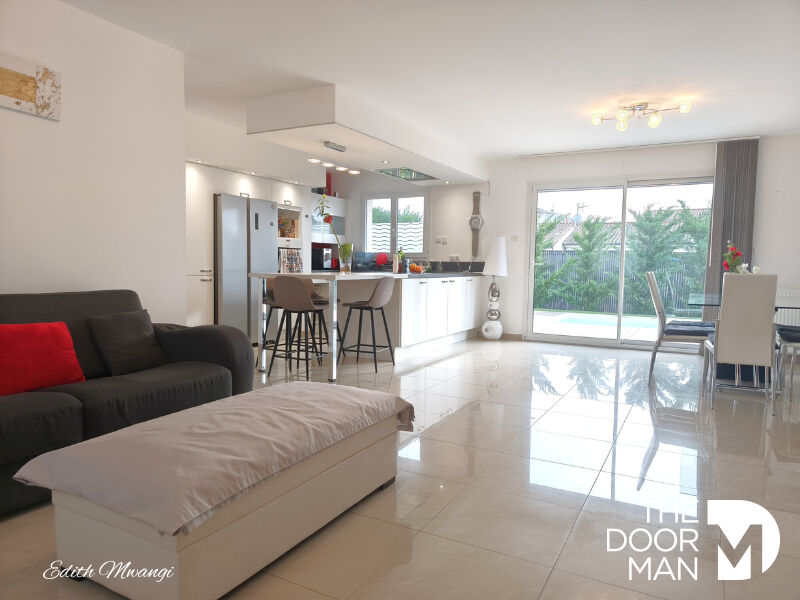 Une belle pièce de vie lumineuse équipée d'un store intérieur et d'une PAC réversible Daikin, une cuisine dinatoire ouverte et équipée avec des matériaux de qualité, ainsi qu'un cellier / buanderie.
