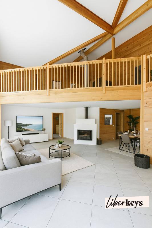 La pièce maîtresse de la maison est une pièce de vie de 58 m² baignée de lumière, prolongée par une cuisine équipée de 17 m² au design soigné avec plan inox sur mesure. L'ensemble salon-salle à manger-cuisine atteint 75 m², idéal pour recevoir en toute convivialité.