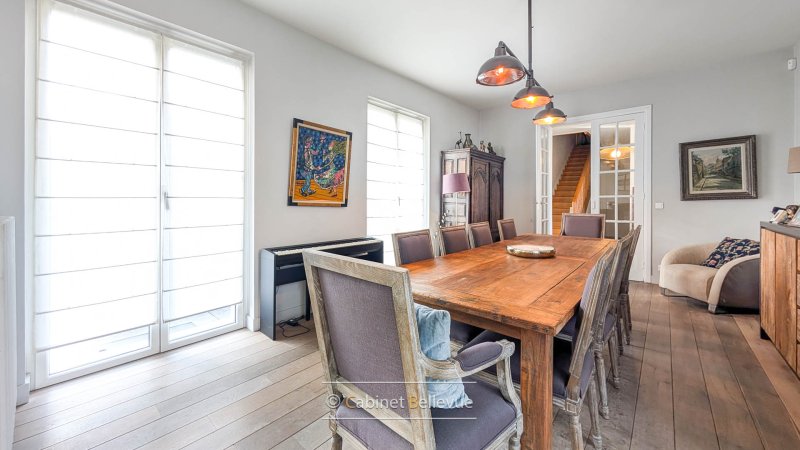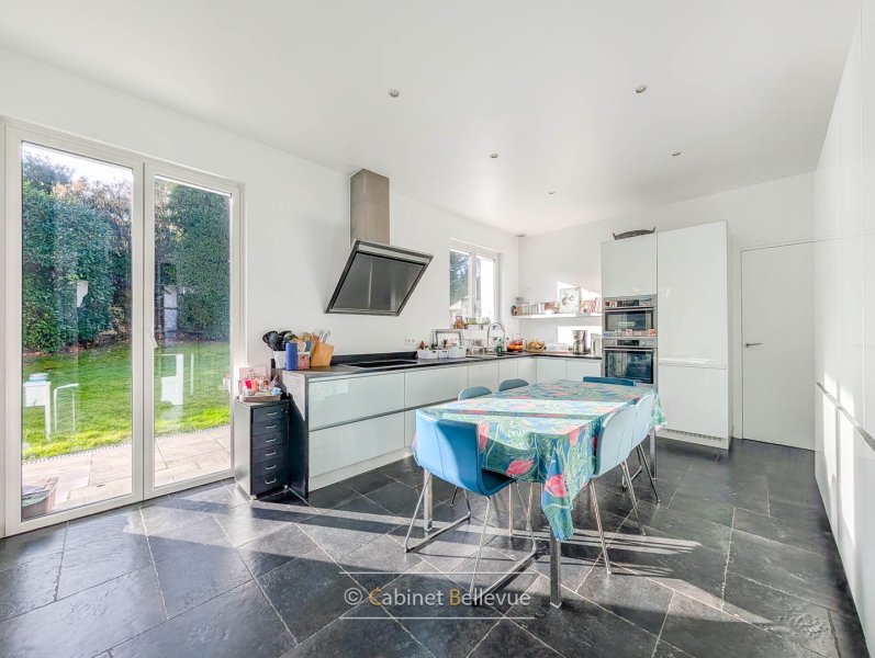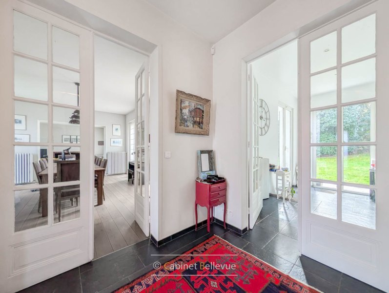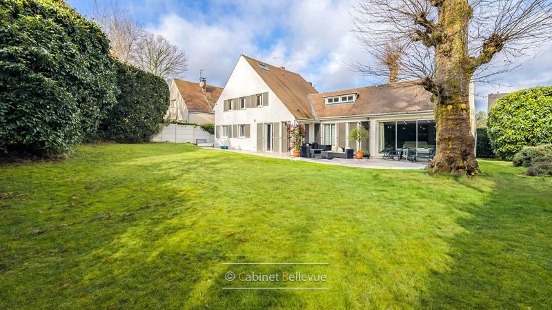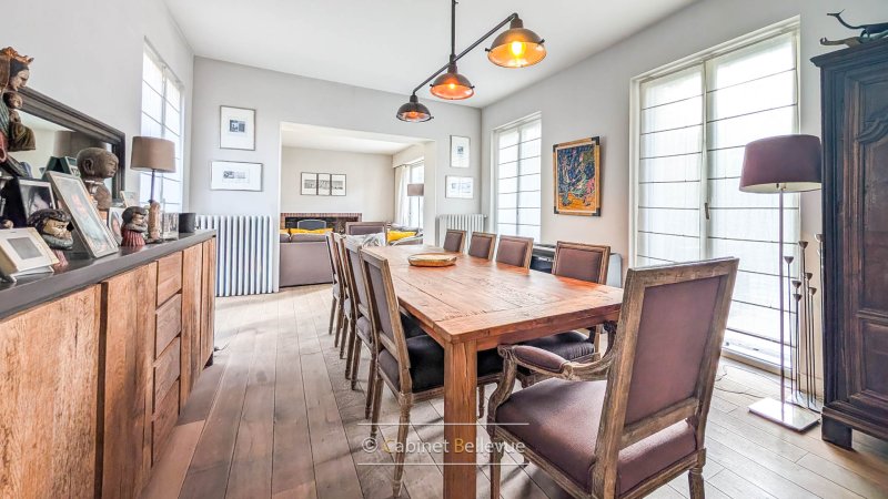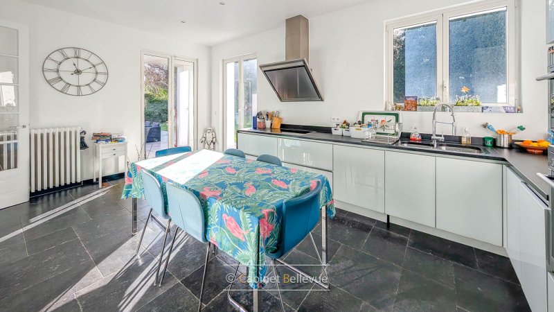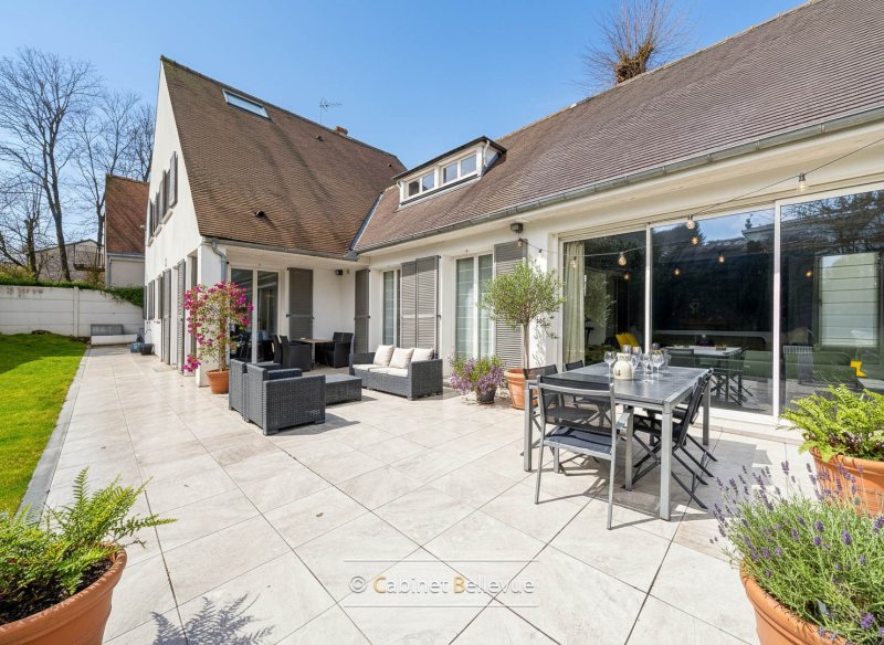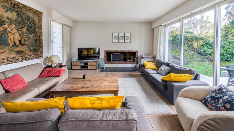 Sèvres Rive Gauche, limite Meudon Bellevue. Belle maison familiale non mitoyenne de 231m2 édifiée sur un terrain de 1 009 m2. Rare sur le secteur, la maison offre une vie de plain-pied et ne s'élève que sur un seul étage, alliant confort et fonctionnalité. Au niveau du jardin, majoritairement exposé plein sud, la maison s'organise autour de superbes espaces de réception. Elle offre un vaste ensemble de 52 m2 comprenant un salon traversant avec cheminée et une salle à manger, le tout ouvert sur l'extérieur. Une cuisine à vivre de 22 m2, également de plain-pied, complète cet espace convivial, pensé pour une vie familiale et de réception. Au même niveau, un espace offre la possibilité d'un petit appartement indépendant composé d'une chambre, d'une salle de douche et de WC, idéal pour accueillir famille, invités ou envisager une activité indépendante. A l'étage, une suite parentale de 25m2 avec dressing ainsi qu'une salle d'eau avec douche à l'italienne. Également un espace pour les enfants avec trois chambres ainsi qu'une salle de jeux, une salle de bains et des WC. Pour compléter l'ensemble, un bureau a été aménagé dans le comble de la maison ainsi qu'une petite pièce de rangement. Au sous-sol, une cave à vin, une autre cave, une chaufferie ainsi qu'un garage pour potentiellement 2 voitures avec la possibilité de stationner 2 autres véhicules dans la propriété.