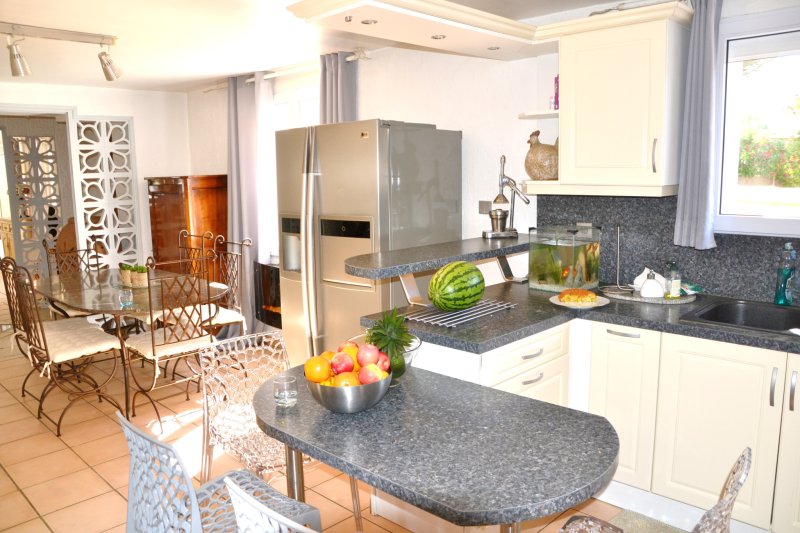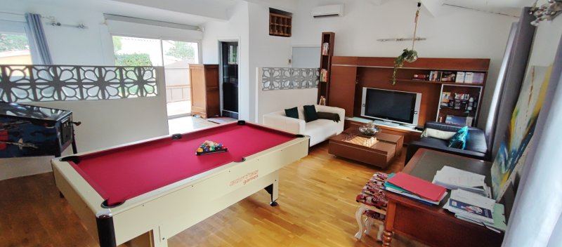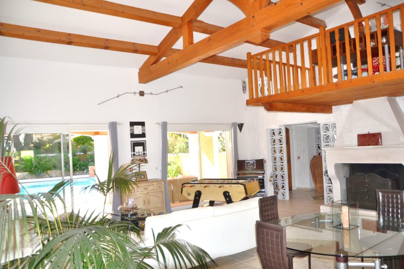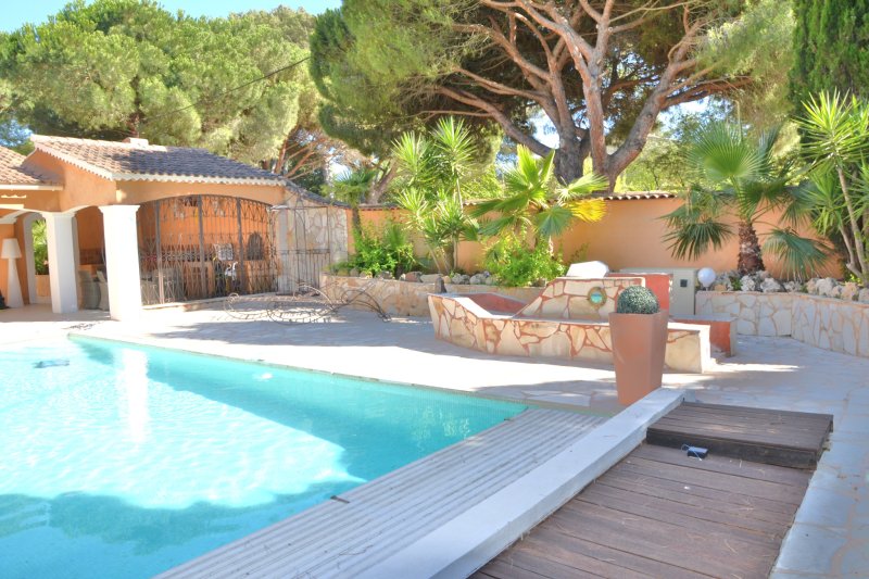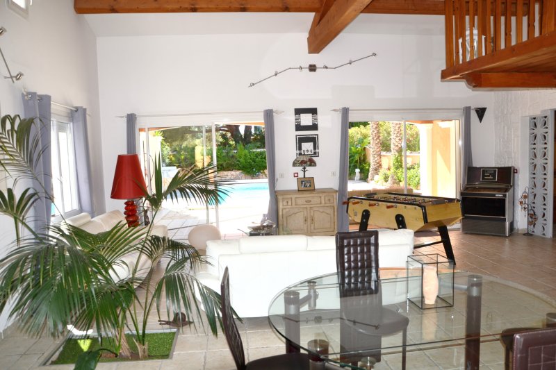 Située dans un havre de paix, maison T6 de caractère alliant de superbes volumes à des prestations de qualité. D'une superficie de 260m2 agencée d'un séjour traversant de 70m2 à l'imposant toit cathédrale et cheminée, ouvert sur ses terrasses, piscine et pool-house, d'une cuisine semi ouverte équipée, d'une chambre de Plain-pied, SDD et buanderie, d'une salle de jeux et hammam de 70m2. A l'étage: 3 chambres, SDB et toilettes indépendantes. Garage double de 50m2. A 1km des plages du Brusc et 2 kms du centre ville dans un cadre d'exception. Contact: Pascale TORT-Harmony Immo 06 60 07 95 01