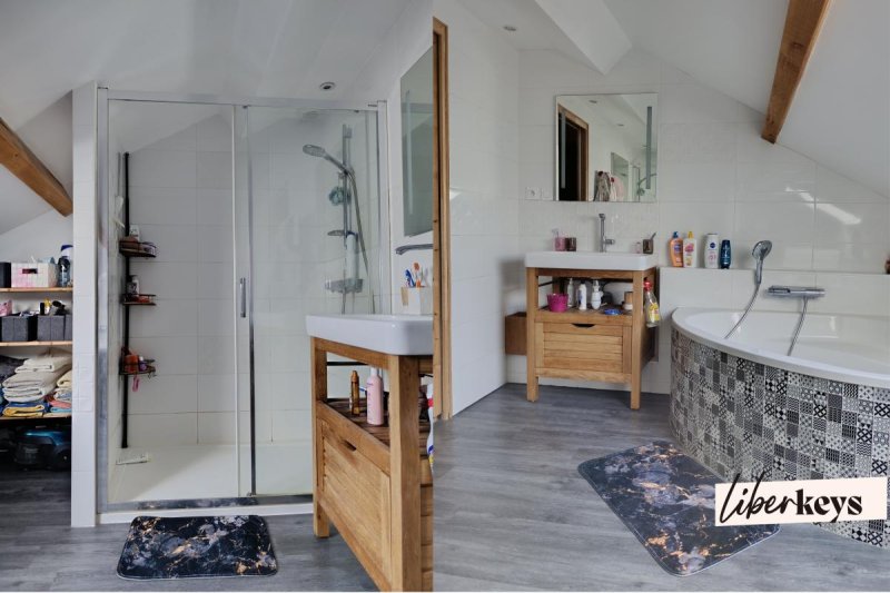 -une salle de bains avec douche et baignoire ( 2 vasques),