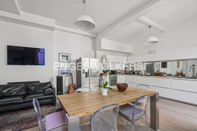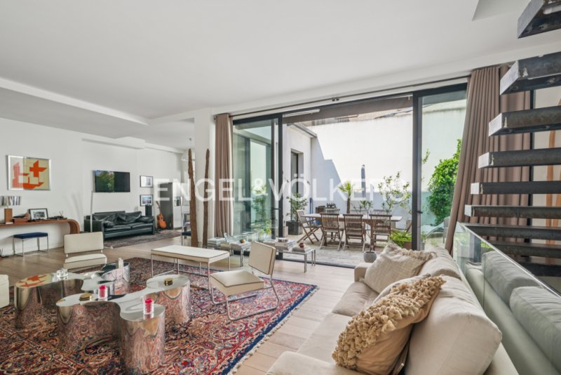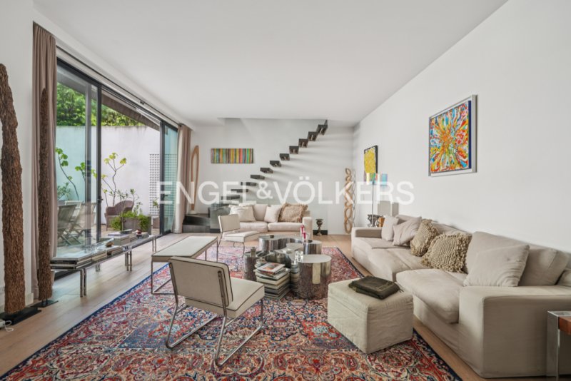 Au rez-de-chaussée : une belle entrée avec coin terrasse de 14m², un vaste séjour lumineux avec une cuisine ouverte et équipée donnant sur une terrasse orientée Est de 33m².