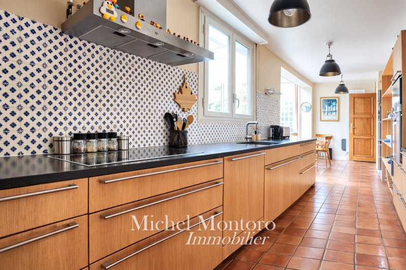 La cuisine dinatoire de 26 m², conviviale et fonctionnelle, bénéficie d'une agréable vue sur le jardin et donne accès à une seconde terrasse.