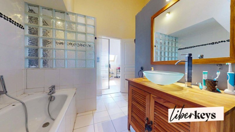 Elle se compose d'une entrée avec placard, un WC avec lave mains, un espace buanderie avec son ballon d'eau, une cuisine américaine aménagée et équipée ouverte sur un double séjour donnant accès sur 2 jardinets dont un avec une grande terrasse plein sud.