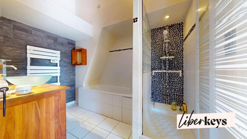 À l'étage un palier avec un grand espace pouvant être aménagé en un bureau et/ou une salle de jeux, deux grandes chambres avec dressing, une salle de bains avec douche et un WC. Deux places de parking viennent compléter ce bien.