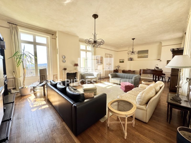 - Au premier étage : d'un grand salon TRAVERSANT de près de 60 m² avec une VUE PANORAMIQUE INCROYABLE. Parquet ancien en chêne, 2 belles CHAMBRES, un dressing, et une salle de bains avec toilettes.