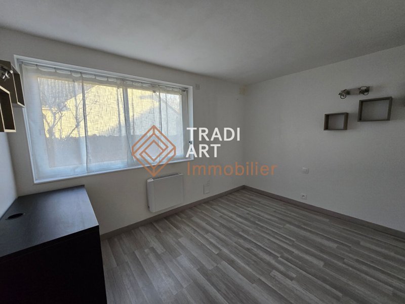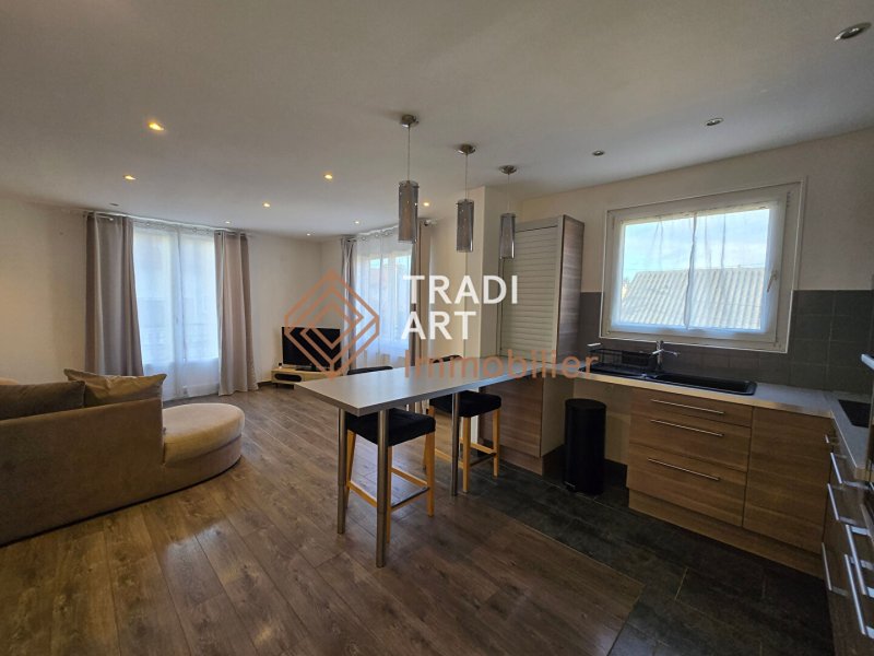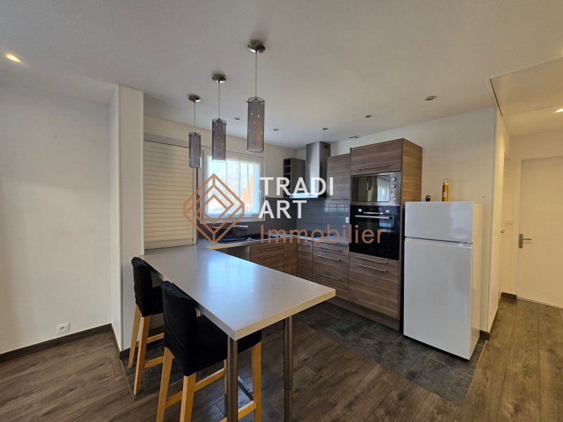La maison propose un séjour lumineux avec accès direct au balcon, sublimé par un parquet chaleureux. La cuisine aménagée et équipée (plaques, hotte, micro-ondes) offre un espace convivial et pratique au quotidien.