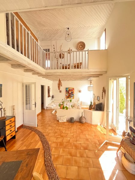 - Au rez-de-chaussée : une spacieuse entrée, un séjour/salon de 40 m² avec accès direct à la terrasse, une cuisine indépendante équipée, une chambre, un bureau, une salle d'eau et un WC.