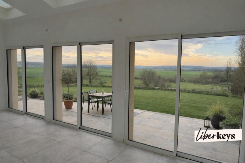 Cet espace se prolonge naturellement vers le jardin exposé plein sud, avec vue dégagée sur la campagne et les champs : un cadre rare, idéal pour profiter des beaux jours.