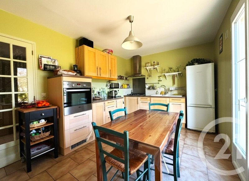 Elle se compose d'une grande entrée cathédrale avec placard, donnant accès à un double séjour traversant et lumineux, équipé d'une cheminée à insert fermé. La maison dispose également d'une cuisine indépendante, aménagée et équipée, d'une salle d'eau avec espace buanderie, ainsi que d'un WC indépendant, complétant le rez-de-chaussée.