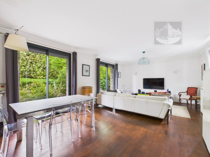 Un grand salon séjour de 34m² avec cheminée de plein pied sur le jardin sans vis à vie.