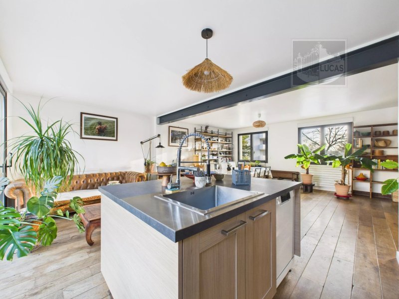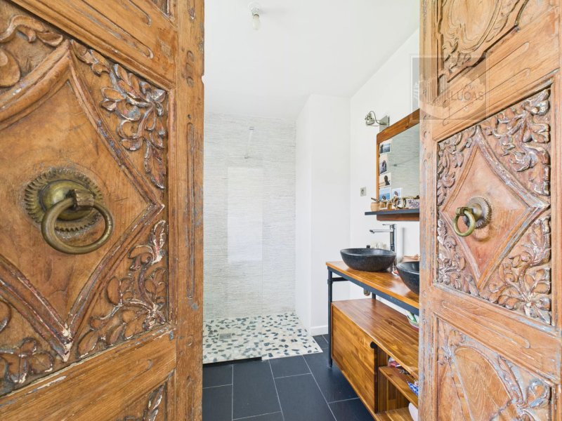 Au rez-de-chaussée, piece de vie traversante est/ouest de 60 m², de plain-pied sur la terrasse et le jardin, ainsi que deux chambres, dont une suite parentale avec sa salle d’eau.