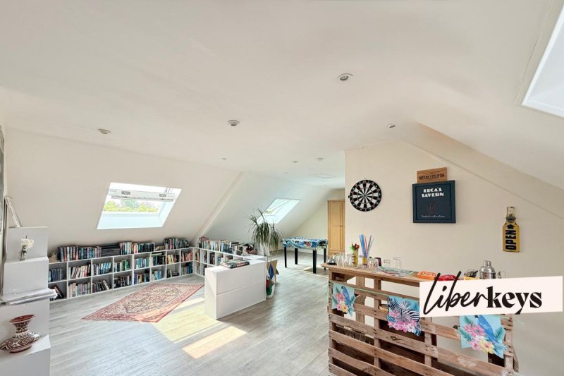 oÉtage : grand palier de 30 m² (52 m² utiles) baigné de lumière grâce à ses vélux (2024), 3 chambres (15, 17 et 20 m²), salle de douche avec WC, dressing.