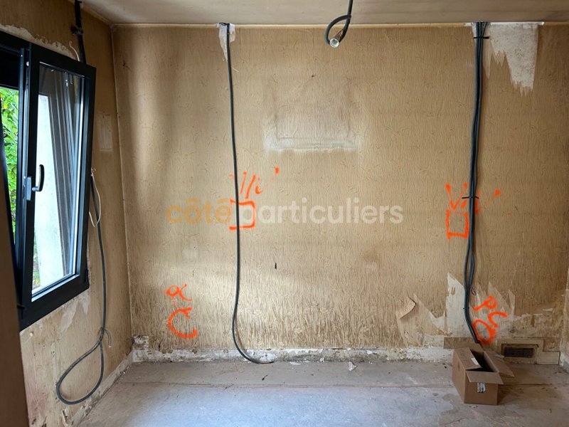 Maison de plain pied située en fond de parcelle ( pas de possibilité de rentrer un véhicule) comprenant : entrée, séjour, cuisine, deux chambres, dégagement, salle d'eau, WC, cellier, une cave de 14 m². Combles à usage de stockage. Toiture récente, porte et fenêtres en aluminium neuve, électricité neuve. Prévoir aménagement intérieur en totalité.