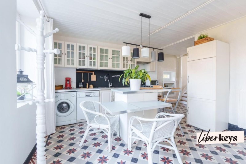 Elle se compose au rez-de-chaussée, d'une cuisine toute équipée et fonctionnelle, d'une salle à manger conviviale avec cheminée, d'une chambre avec dressing et d'un salon chaleureux avec mezzanine accueillant un espace chambre et donnant accès à une terrasse surplombant un jardin joliment arboré.