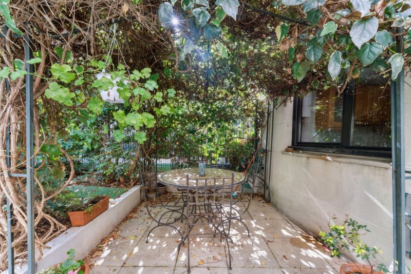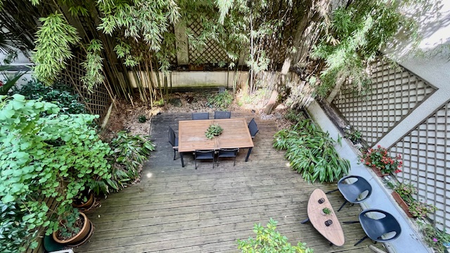Nichée dans un jardin à l'arrière d'un petit immeuble de très bon standing, à l'abri des regards, cette maison agrémentée d'une terrasse spacieuse de 44 m², parfaite pour des moments de détente en plein air, ainsi que d'un jardin verdoyant et d'un patio charmant,