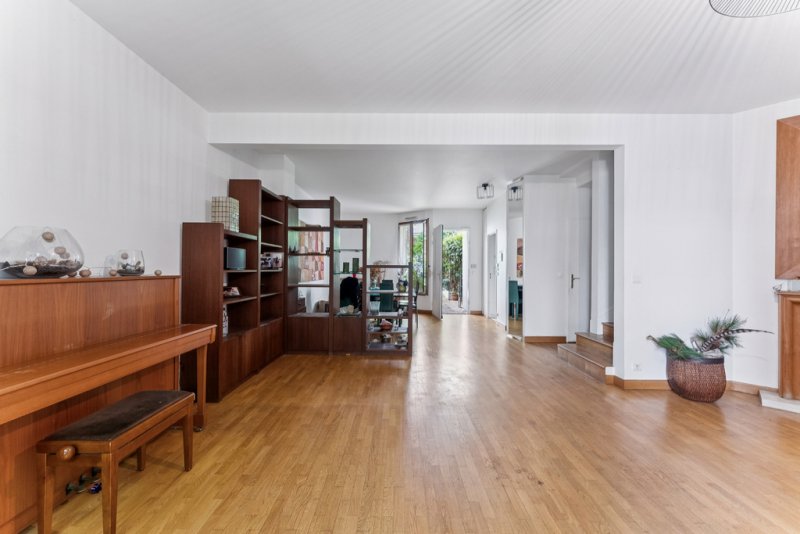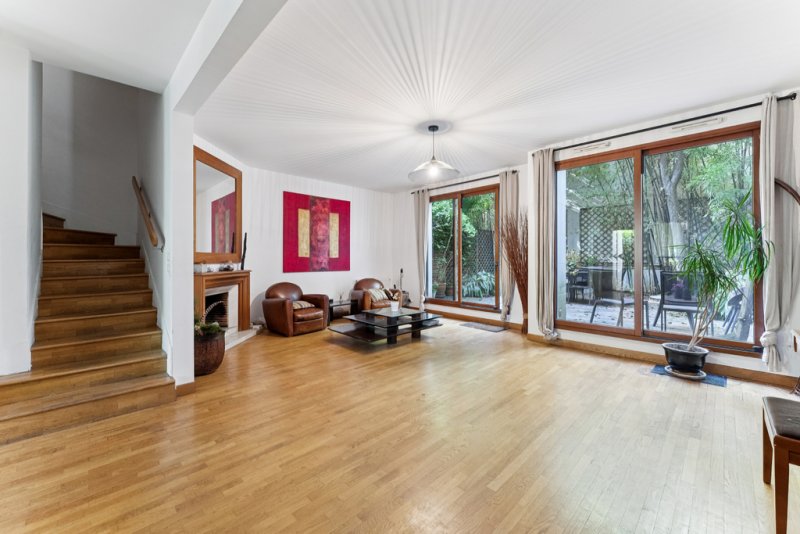 Maison traversante avec jardin sur quatre niveaux d'une superficie totale au sol de 222m² (165,96 m² « Carrez ») avec plus de 100 m² d'espaces extérieurs. Calme absolu et lumineux.