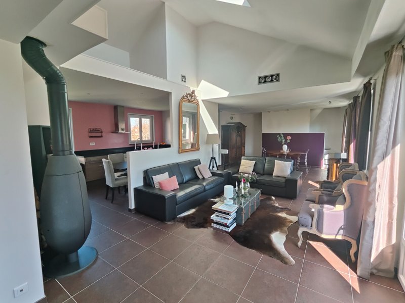- Rez-de-chaussée : Double séjour cathédrale traversant donnant sur une vaste terrasse plein sud (salon, salle à manger, salon TV), vaste cuisine ouverte, suite parentale de 25 m² avec dressing et salle d'eau privative, WC séparé.