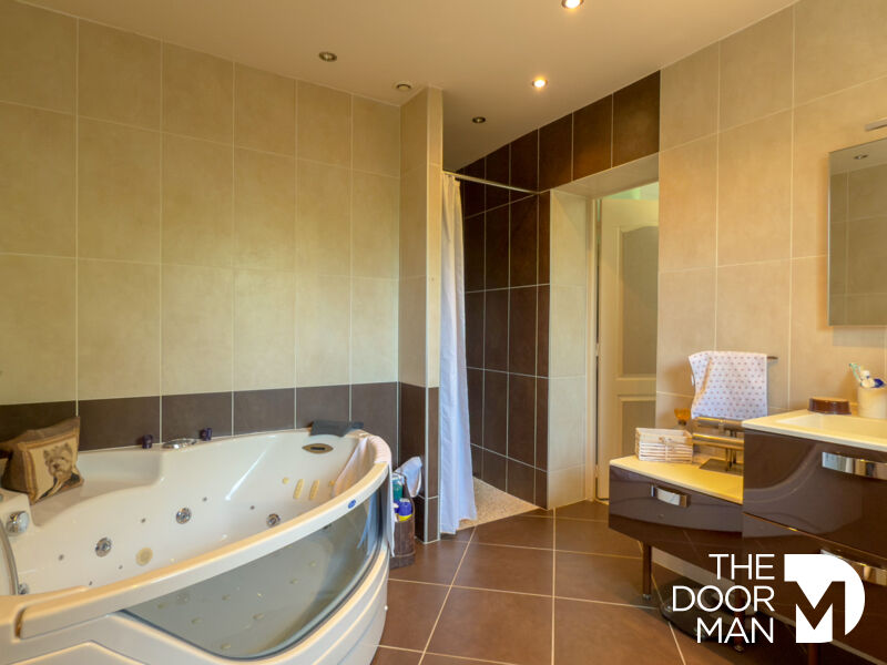 Une chambre, une salle de bain avec baignoire balnéo et douche italienne,un toilette et un dressing/ buanderie.