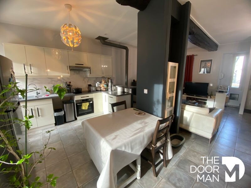 Elle se compose d'un RDC entièrement carrelé : séjour avec poêle à bois, cuisine aménagée ouverte avec accès direct sur la terrasse extérieure, cellier / buanderie avec porte sur l'extérieur. Au 1er étage, un chaleureux palier dessert 2 grandes chambres, une SDB (douche et baignoire) avec WC et fenêtre et une dernière chambre dans les combles (avec rangements).