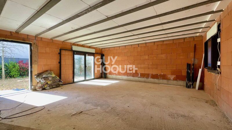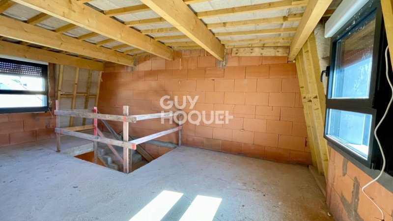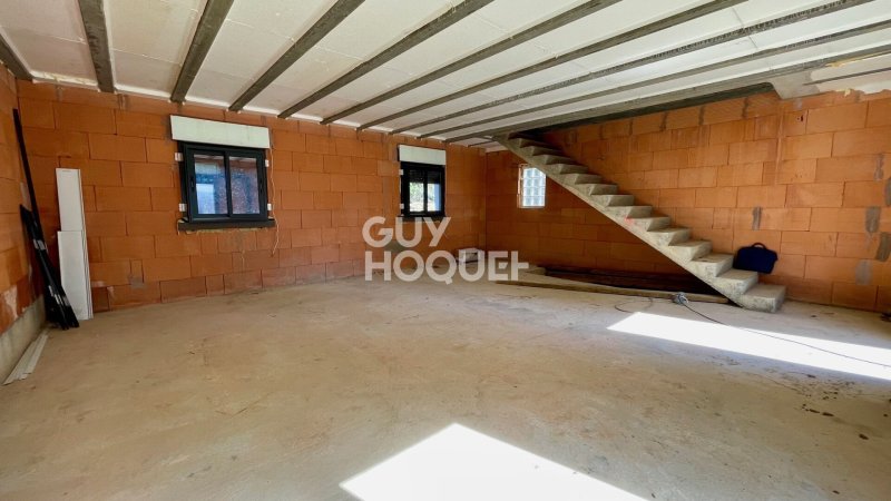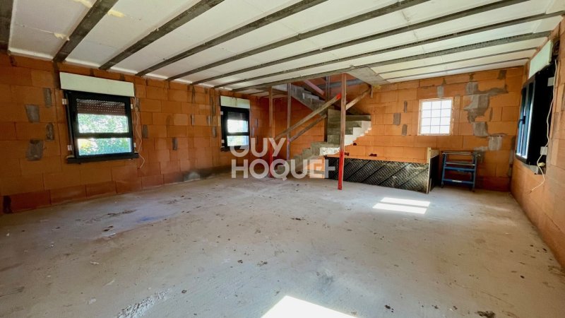 Travaux de gros oeuvre terminés : raccordée à l'eau, assainissement et EDF, toiture, zinguerie, fenêtres et portes installées, ravalement extérieur réalisé.