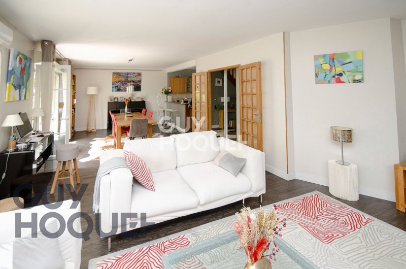 Une spacieuse pièce de vie de 40 m² baignée de lumière naturelle, ouverte sur une terrasse et jardin exposés Sud-Est,