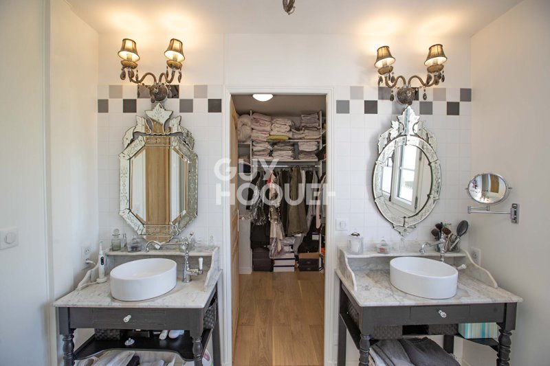 À l'étage, l'espace nuit se distingue par son équilibre et son confort : deux chambres lumineuses, une salle de bains indépendante, ainsi qu'une suite parentale avec dressing et salle de bains privative, pensée comme un véritable cocon.