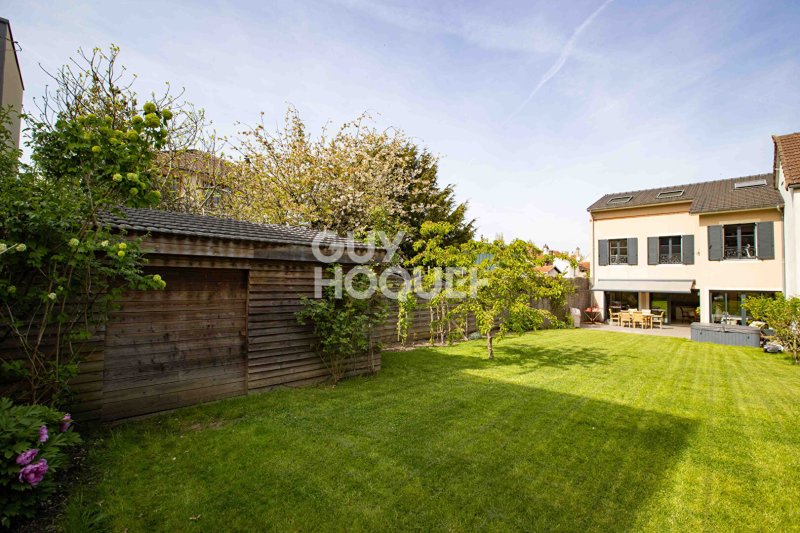 À l'extérieur, le jardin, au calme et exposé plein sud, prolonge avec élégance les espaces de vie et invite à la détente. Il se distingue par la présence de nombreux arbres fruitiers et bénéficie d'une cuve de récupération d'eau de pluie de 5 000 litres, un atout à la fois écologique et pratique pour l'entretien des extérieurs. Un abri de jardin de 10 m², offrant un espace de rangement appréciable, complète l'ensemble.