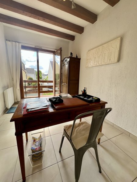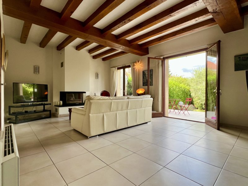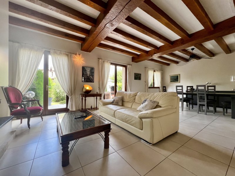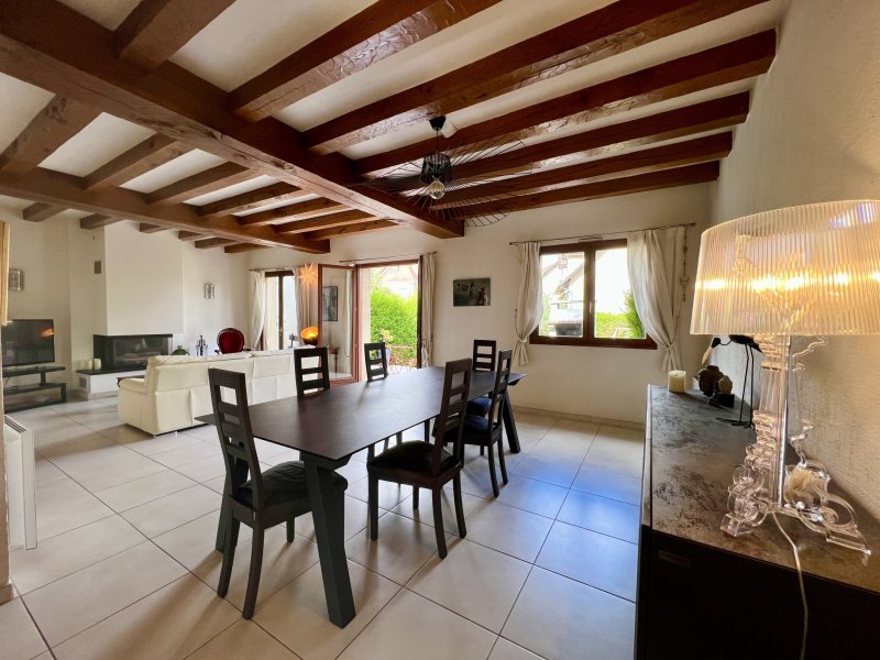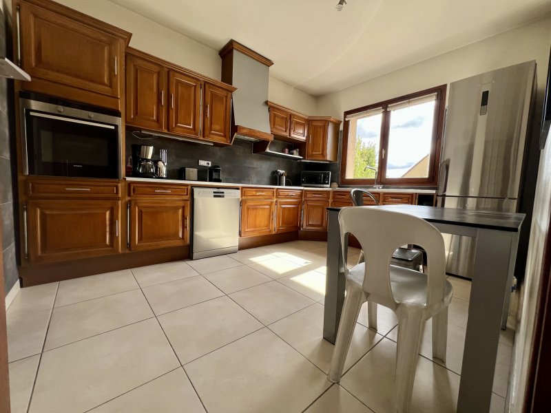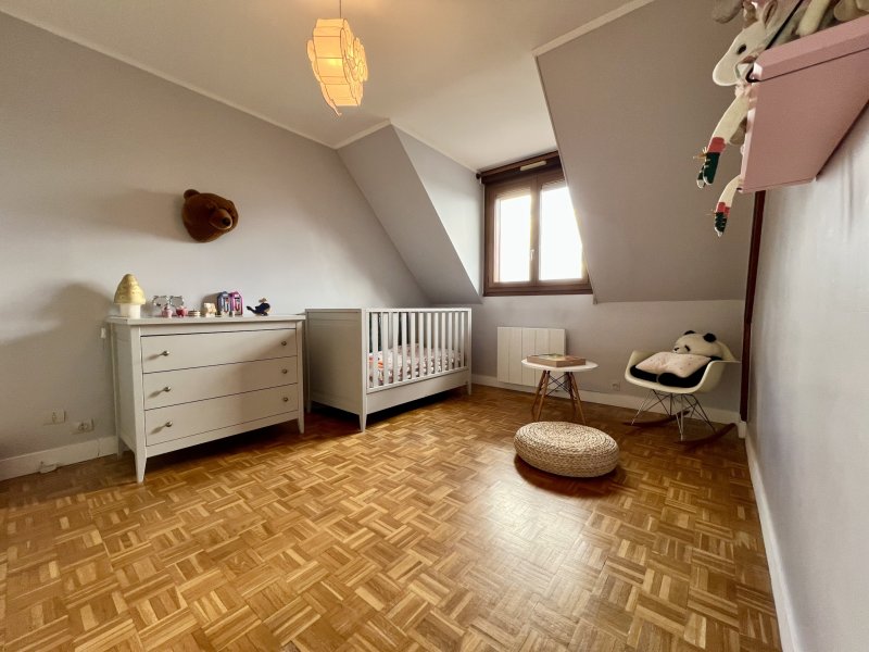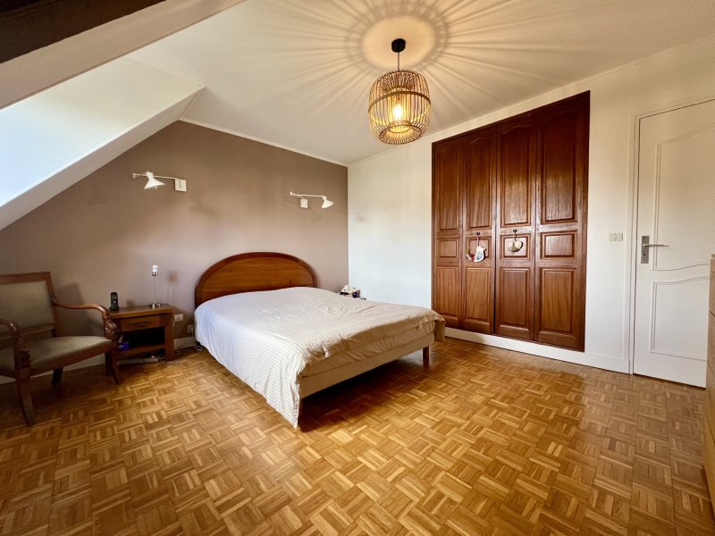 Située au calme d'une impasse privée, belle maison familiale de 1986 dans un quartier calme et résidentiel. Elle comprend : Au rez-de-chaussée : une entrée avec rangements, une cuisine séparée aménagée et équipée communiquant avec le séjour, un double séjour de plus de 40m2 avec cheminée à insert et deux portes fenêtres doubles donnant sur la terrasse et le jardin, une chambre avec sa salle d'eau et un WC séparé. A l'étage : un palier distribue en étoile 3 belles chambres parquetées dont 2 avec grands rangements intégrés et une salle de bains (baignoire et douche). Accès aux combles partiellement aménageables. Sous-sol total comprenant un garage double (porte électrique), une buanderie et 2 pièces de rangements dont une donnant accès au jardin. Belle terrasse avec barbecue. Jardin clos. Maison très bien entretenue en parfait état. Travaux récents (fenêtres, électricité, radiateurs, chauffe-eau).