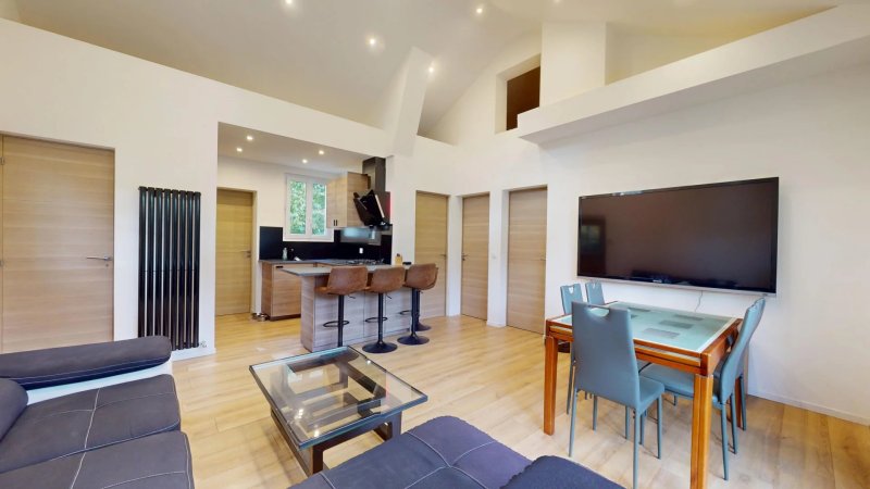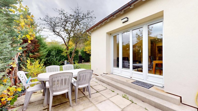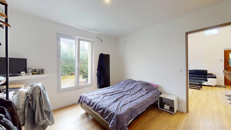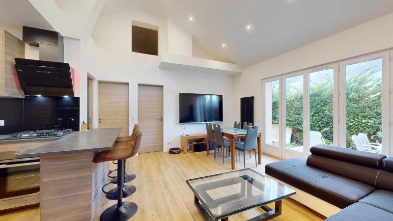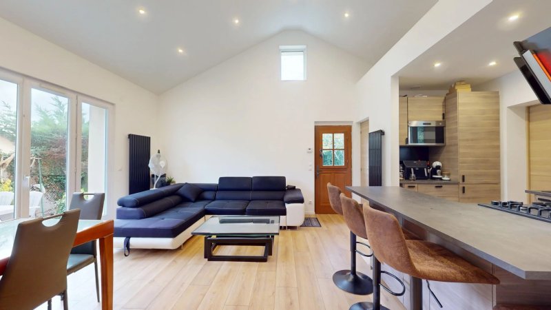 En lisière de forêt, ce pavillon agréable à vivre se compose d'une entrée ouvrant sur un salon-salle à manger avec une superbe hauteur sous plafond, offrant un accès direct à une terrasse intime.