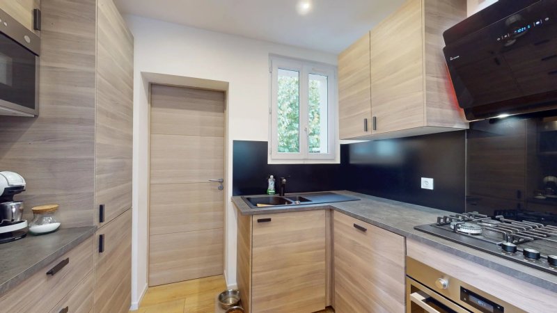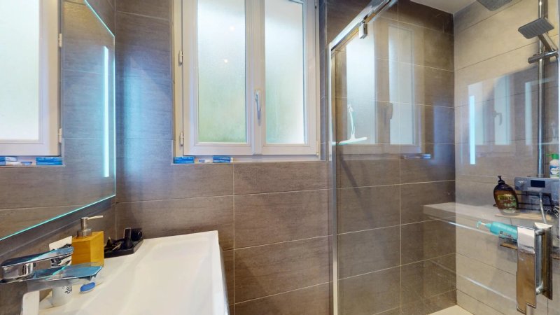 La cuisine ouverte et moderne est suivie d'une buanderie. Vous trouverez également des toilettes indépendantes avec fenêtre, une salle d'eau avec une belle douche à l'italienne, ainsi que deux chambres.