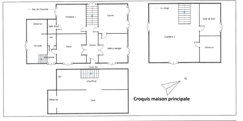 La maison principale se compose d'un séjour, d'une salle à manger, d'une cuisine séparée, d'une chambre, de WC, d'une véranda et, à l'étage, d'une grande pièce mansardée avec salle de bains et WC.