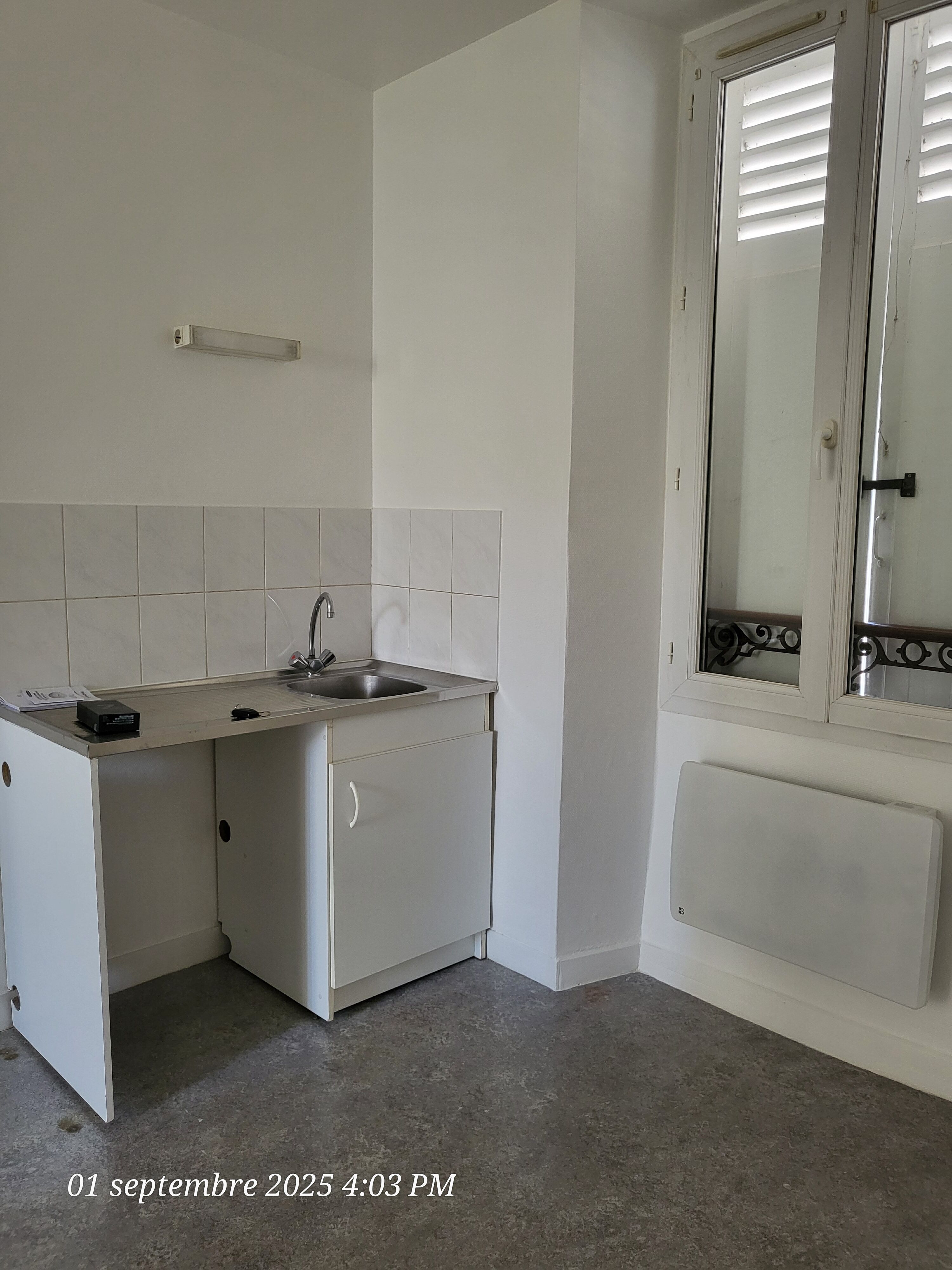 5' RER, petit immeuble rural, Appartement F1: cuisine équipée (plaques, frigo), séjour, salle d'eau avec wc. 585 EUR C.C D.G...